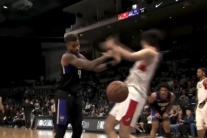 GIF-楊瀚森扣籃后被丹尼斯推倒,倒地后微笑