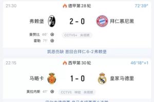 今天的聯(lián)賽比賽,拜仁現(xiàn)在正0-2落后弗賴堡,而皇馬則0-1落后馬略卡。