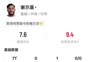體育資訊4月4日訊 足總杯1/4決賽,曼城主場迎戰利物浦,謝爾基首發出戰,貢獻1次助攻,還有3次過人成功和2次關鍵傳球,評分7.6。