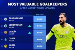 體育資訊4月5日訊 轉(zhuǎn)會市場網(wǎng)更新了門將身價排行榜,目前曼城門將多納魯馬身價4500萬歐元最高,在他身后是布萊頓門將維爾布魯根,身價4000萬歐元。