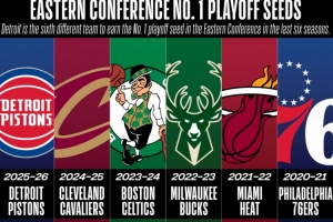 值得一提的是,在過去的六個(gè)賽季中,東部第一分別由六支不同的球隊(duì)輪流坐,分別是76人、熱火、雄鹿、凱爾特人、騎士、活塞。