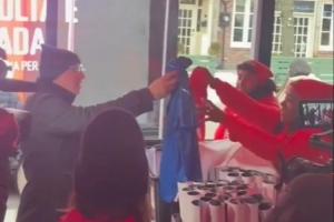 在隊伍的最前端,可以看到球迷們進入一棟建筑領取加拿大的球衣,視頻中有一名球迷將一件藍色的意大利兒童球衣交給志愿者,后者遞給他一件紅色的加拿大球衣。實際上,志愿者們并沒有真的在收集意大利球衣,只是為了免費發放加拿大球衣。