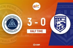 傷停補時4分鐘。上半場比賽結(jié)束,深圳新鵬城3-0武漢三鎮(zhèn)。