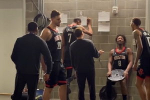 賽后,騰訊ESPN記者孟超發博曬出視頻,并寫道:“險勝勇士之后,火箭賽后在更衣室外全體加練。”